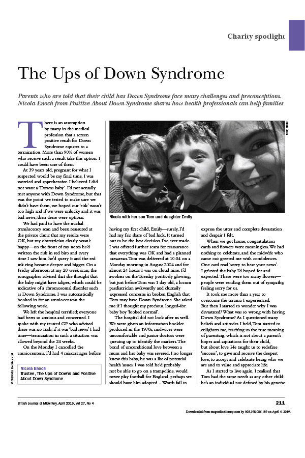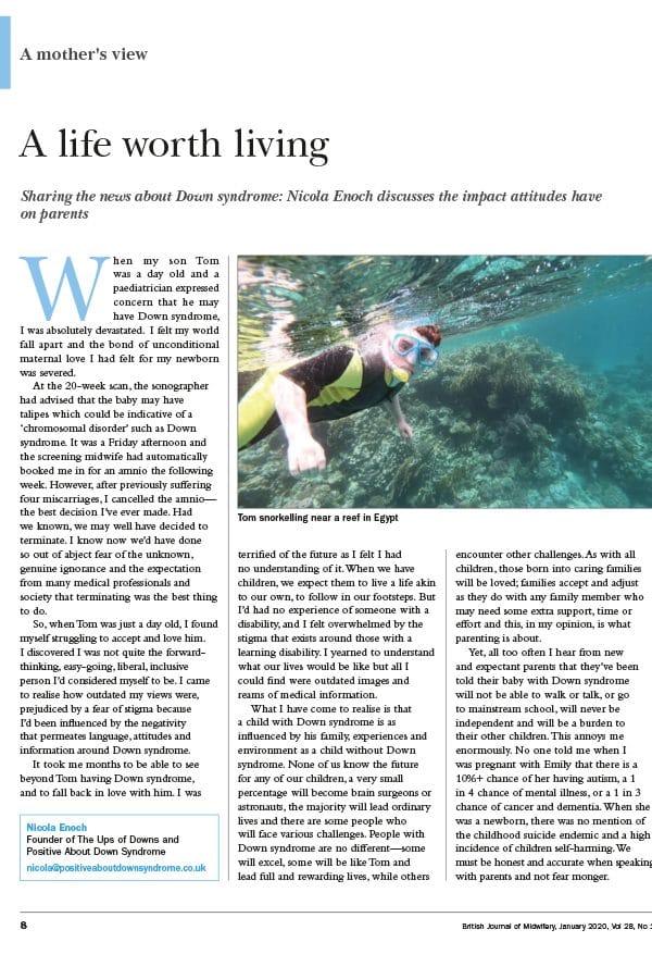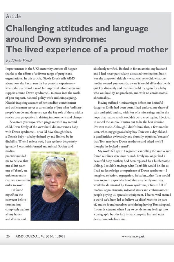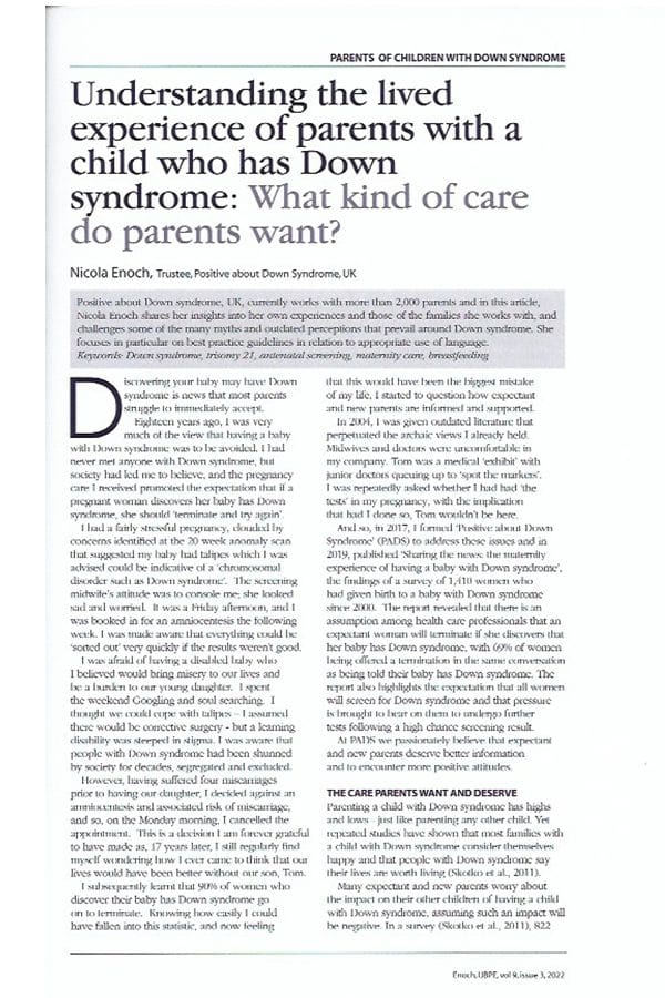 In 2019 we published the findings of a survey of 1,410 women who had had a baby with Down syndrome in the preceding 10 years, in our report Sharing the news, the maternity experience of having a baby with Down syndrome.  This sadly highlights some of the pressures women are put under around screening and continuing a pregnancy with a baby with Down syndrome.  The publication has been published in the BJM and RCM journal.